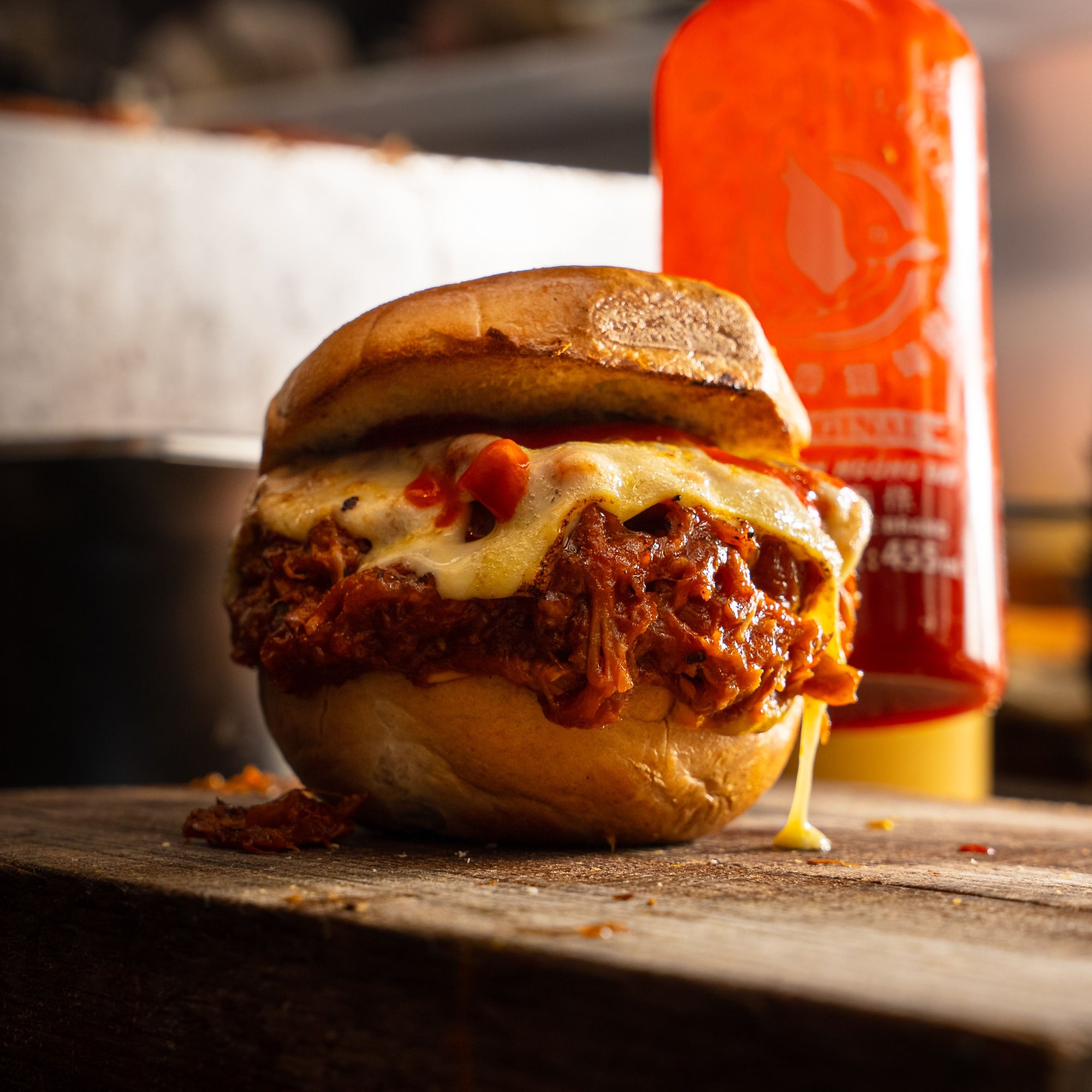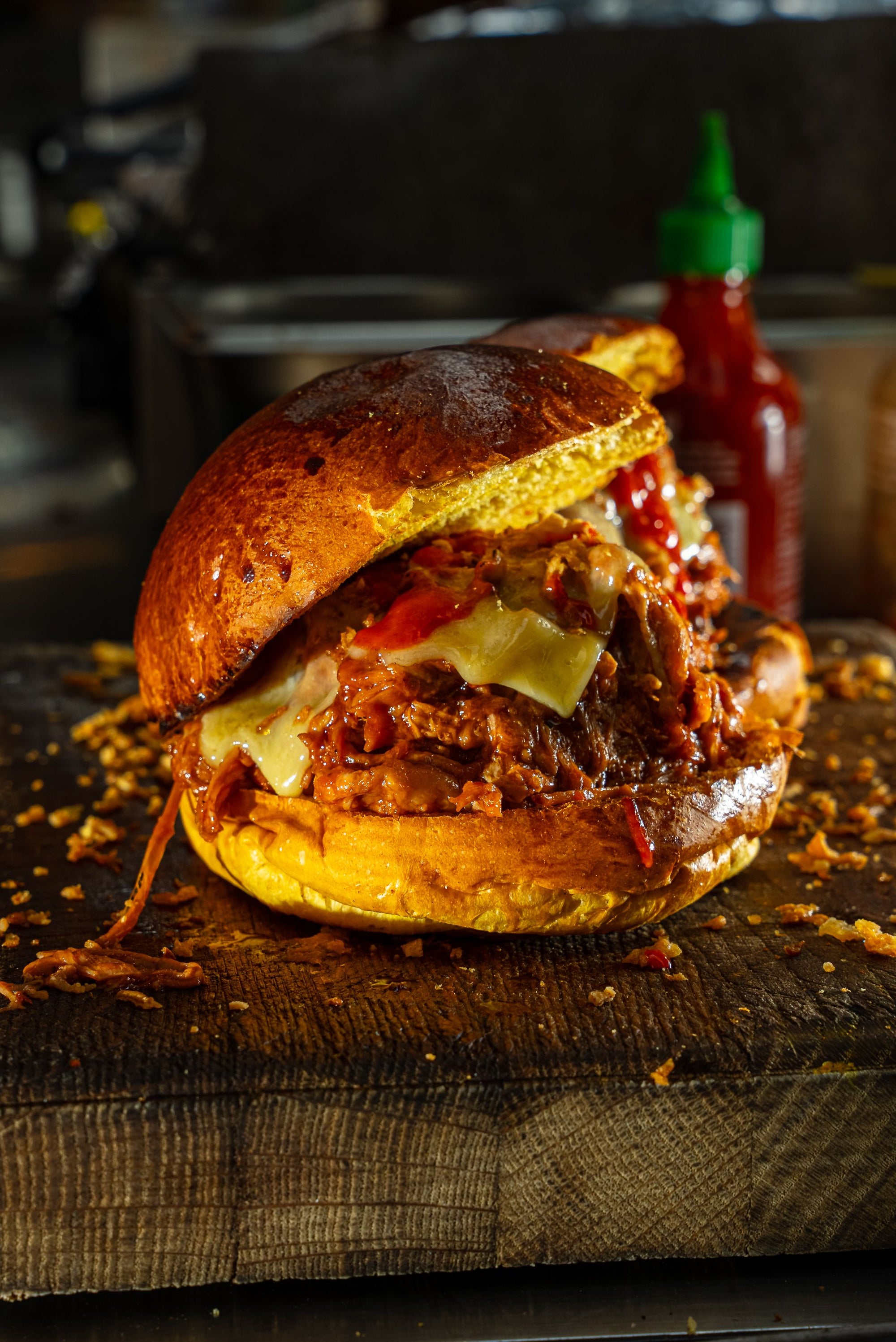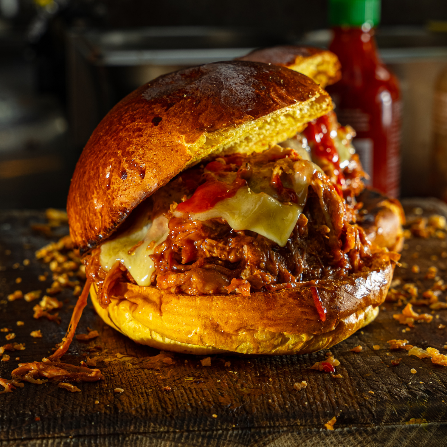 The finest British pork shoulder is marinated for 10 hours and slow roasted for 12. It's pulled, topped with bbq sauce , ABSOLUTELY NO SMOKED..